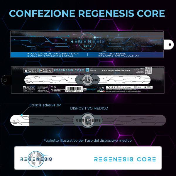 [ COPERTURA 1 ANNO ]Una volta indossato, il dispositivo Medico di Classe 1 REGENESIS CORE, si attiva per differenza di potenziale e trasmette una sequenza di segnali sotto forma di frequenze a bassissima intensità che inducono l’ottimizzazione dei processi ossido-riduttivi (Redox) e modulano l’infiammazione basale.